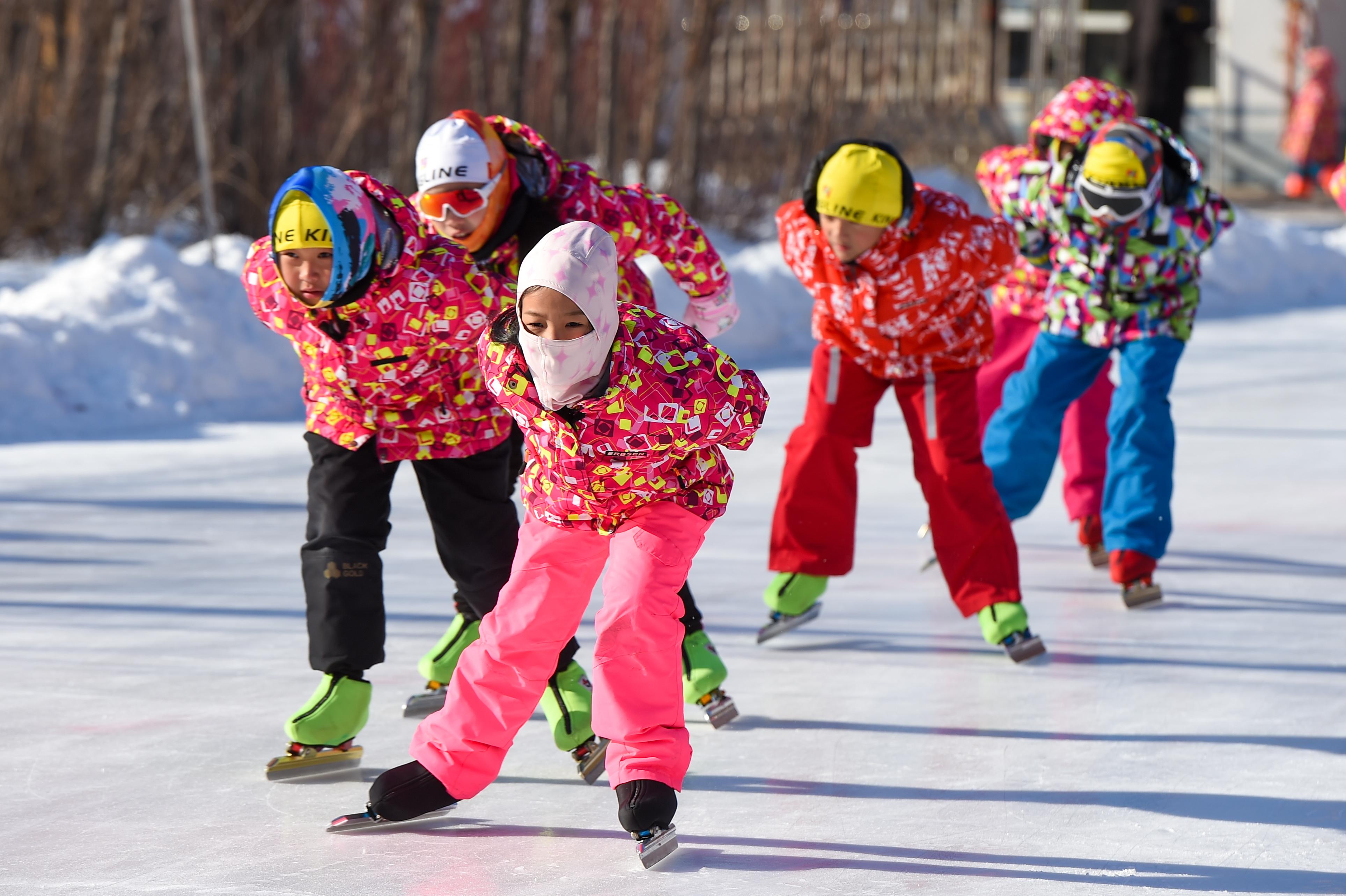1月13日,在吉林省四平市六马路小学,学生们在冰场上滑行。新华社记者 张楠 摄