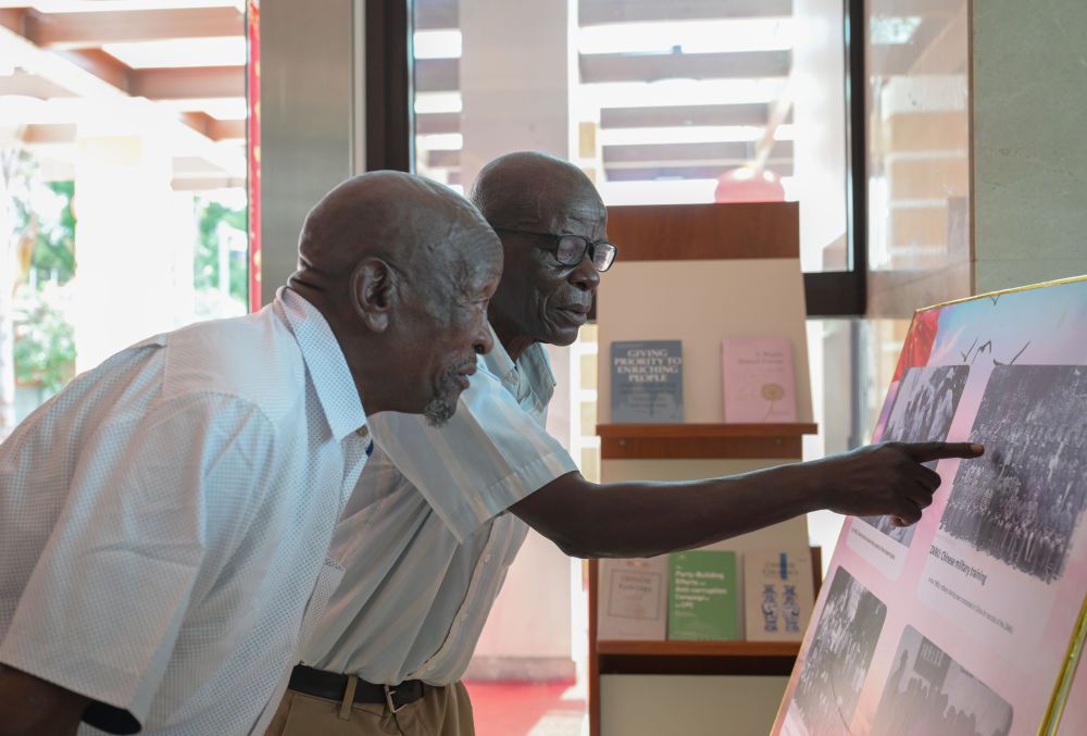 1月28日,在津巴布韦首都哈拉雷的中国大使馆,两名曾在中国接受培训的津巴布韦老战士在展板老照片上寻找自己。当日,大使馆举行向津巴布韦解放斗争老战士转交申博体育:主席复信活动。新华社记者 杨光 摄