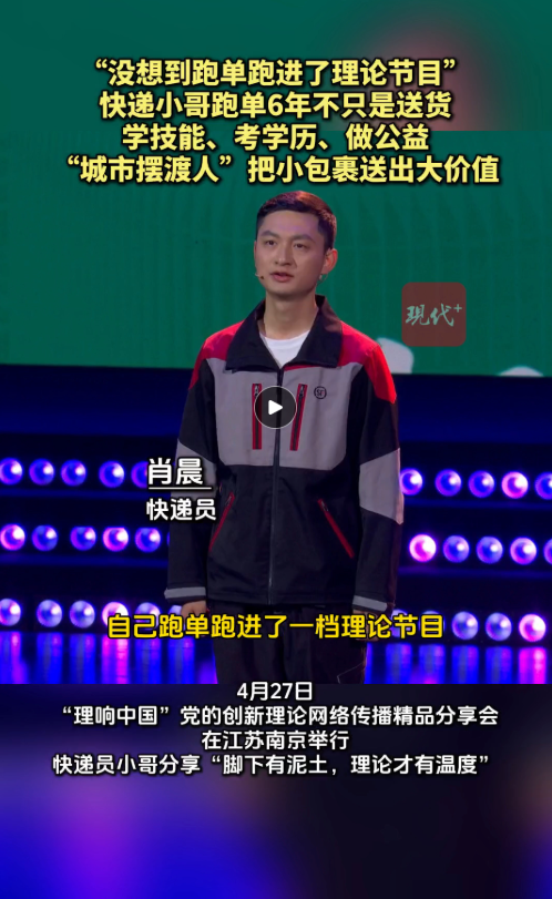 快报讯(记者 卢河燕/文 顾炜/摄)“从来没想到自己跑单跑进了一档理论节目。”4月27日,2026“理响中国”党的创新理论网络传播精品分享会在江苏南京举行。现场,快递员肖晨分享“脚下有泥土,理论才有温度”的实践感悟。