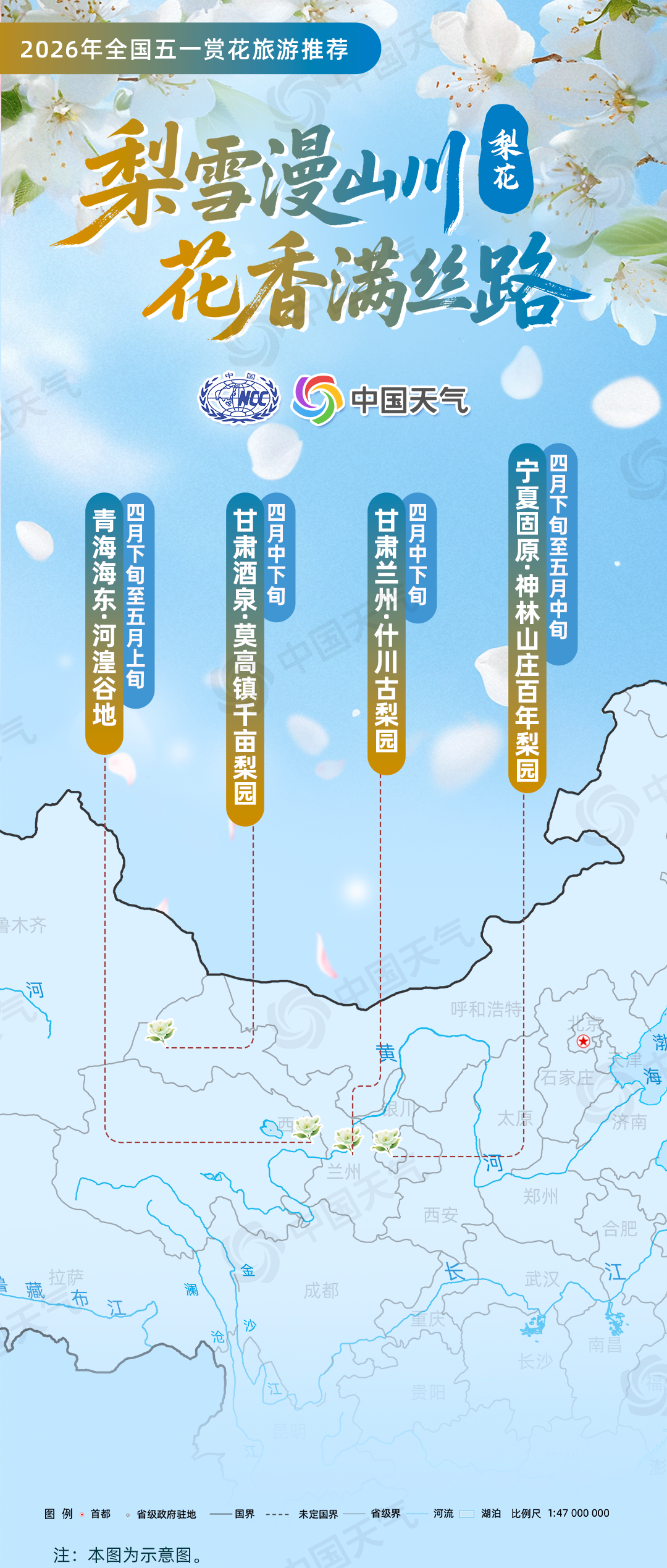 梨花:“梨雪漫山川?花香满丝路”(甘肃兰州什川古梨园、甘肃酒泉莫高镇千亩梨园、青海海东河湟谷地、宁夏固原神林山庄百年梨园);