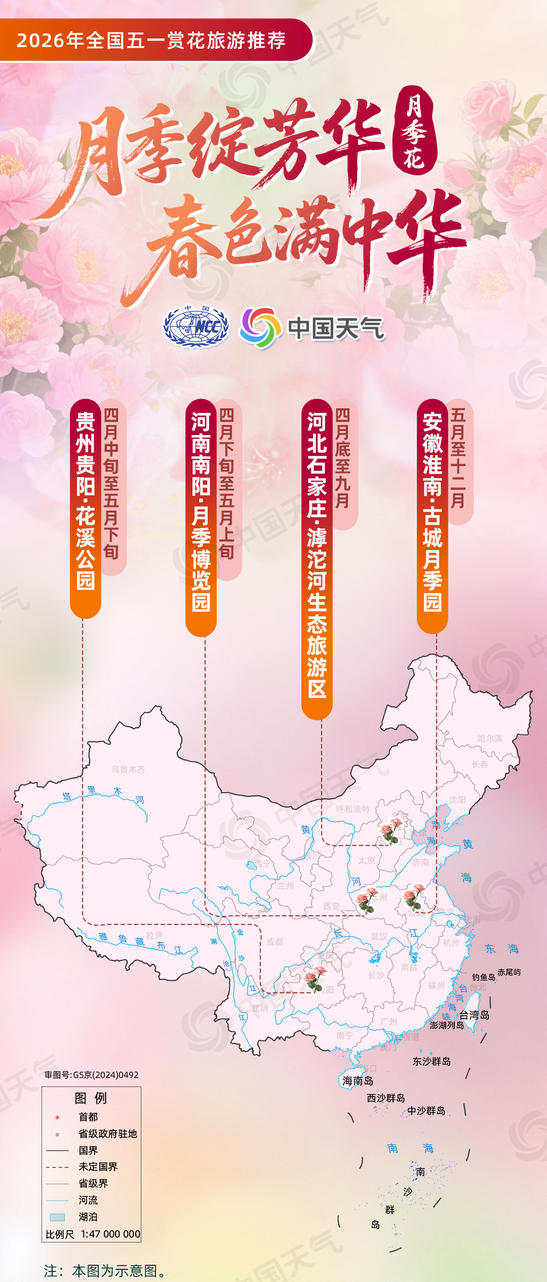 月季花:“月季绽芳华,春色满中华”(河北石家庄滹沱河生态旅游区、安徽淮南古城月季园、河南南阳月季博览园、贵州贵阳花溪公园);