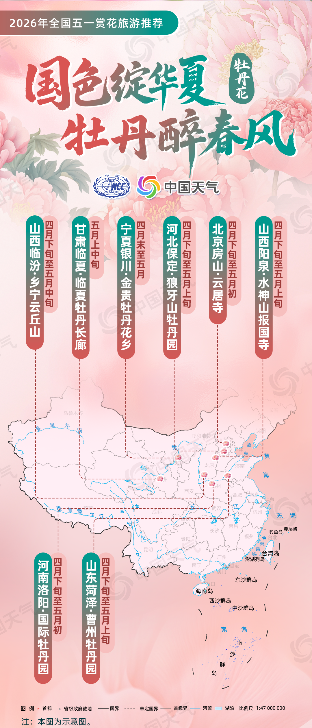 牡丹花:“国色绽华夏?牡丹醉春风”(北京房山云居寺、河北保定狼牙山牡丹园、山西阳泉水神山报国寺、山西临汾乡宁云丘山、山东菏泽曹州牡丹园、河南洛阳国际牡丹园、甘肃临夏牡丹长廊、宁夏银川金贵牡丹花乡);