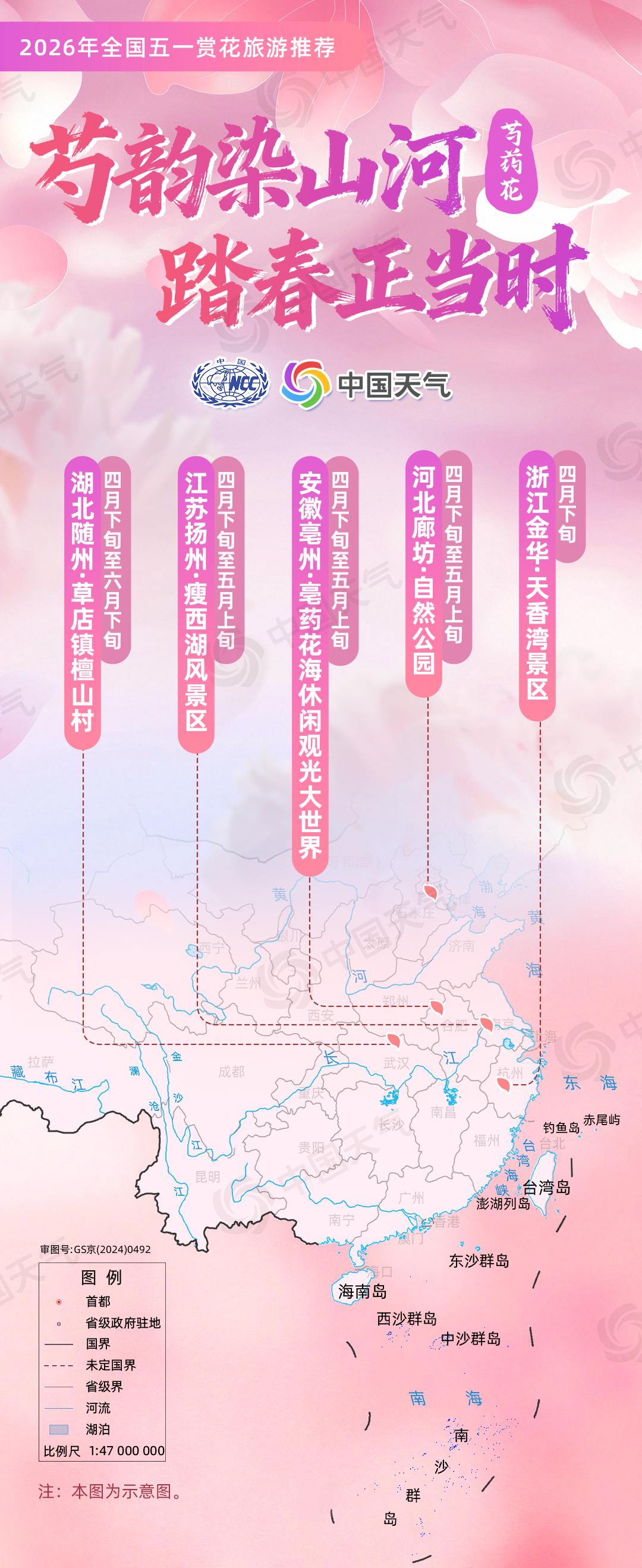 芍药花:“芍韵染山河?踏春正当时”(河北廊坊自然公园、江苏扬州瘦西湖风景区、浙江金华天香湾景区、安徽亳州亳药花海休闲观光大世界、湖北随州草店镇檀山村)。