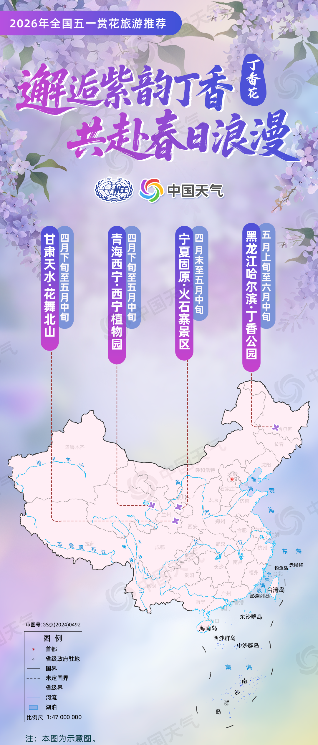丁香花:“邂逅紫韵丁香?共赴春日浪漫”(黑龙江哈尔滨丁香公园、甘肃天水花舞北山、青海西宁植物园、宁夏固原火石寨景区);