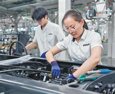 斯堪尼亚江苏如皋工业生产基地内,技术人员正在紧张作业。
