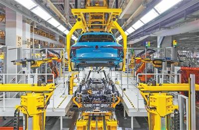 大众安徽整车制造基地生产车间内的电动汽车自动化生产线。