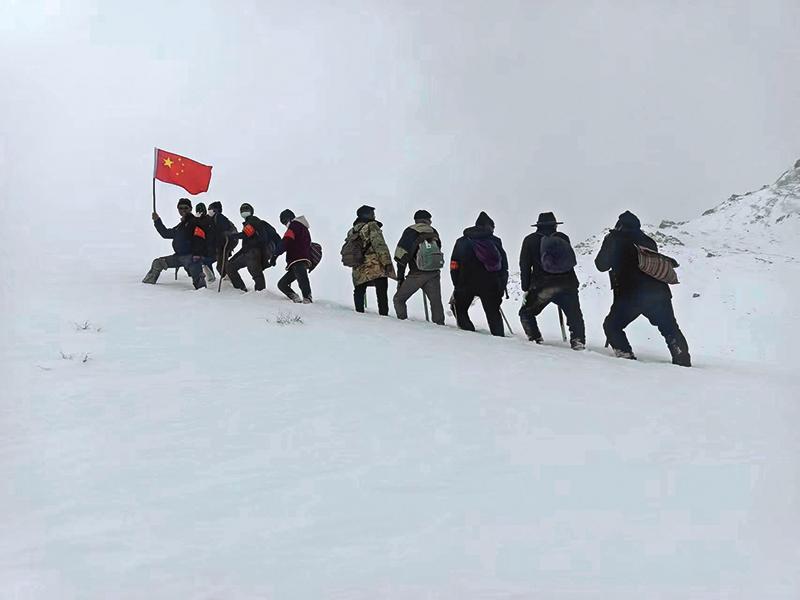 次仁罗布(左二)和村里的固边队员在巡边路上(2024 年 2 月摄)    受访者供图