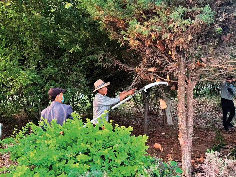 次仁罗布(右)在村里修剪树枝(资料照片)  受访者供图