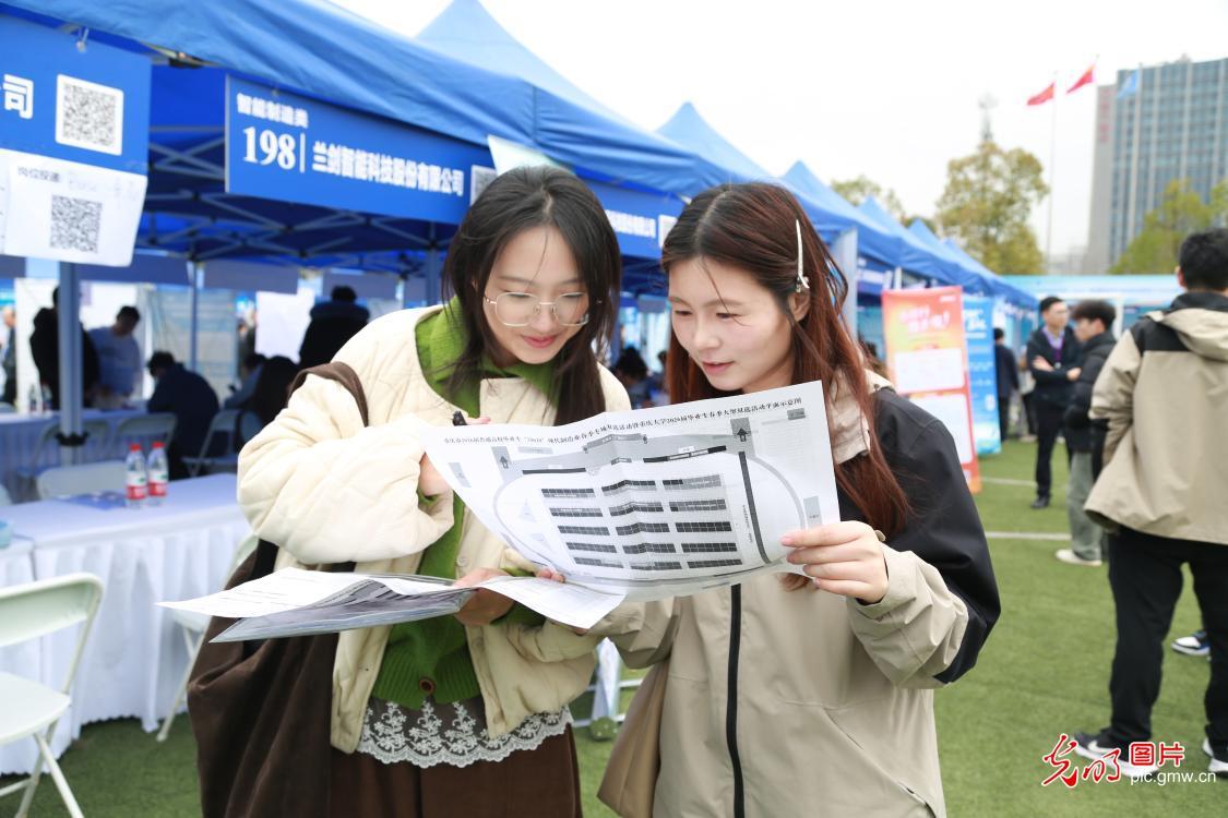 日前,重庆市2026届普通高校毕业生“33618”现代制造业春季专场双选活动暨重庆大学2026届毕业生春季大型双选活动举行。500余家用人单位进校揽才,提供就业岗位2万余个。现场设立“AI智慧求职赋能专区”、职业发展咨询区、政策咨询区等专区,提供AI简历优化、AI面试模拟等服务。高校专家和企业导师提供“一对一”职业指导,解答学生在简历撰写、面试技巧、职业选择等方面的困惑,引导学子树立正确就业观念,科学规划职业发展路径。图为求职者在了解招聘信息。(赵杰昌摄/光明图片)