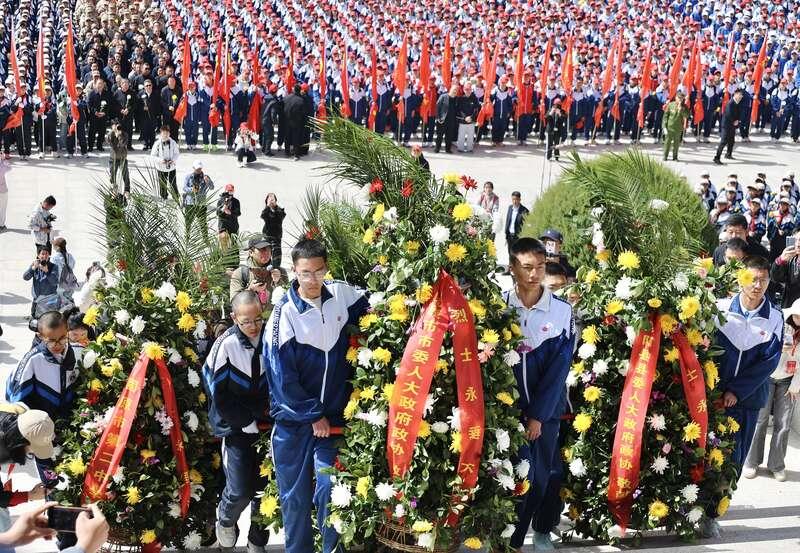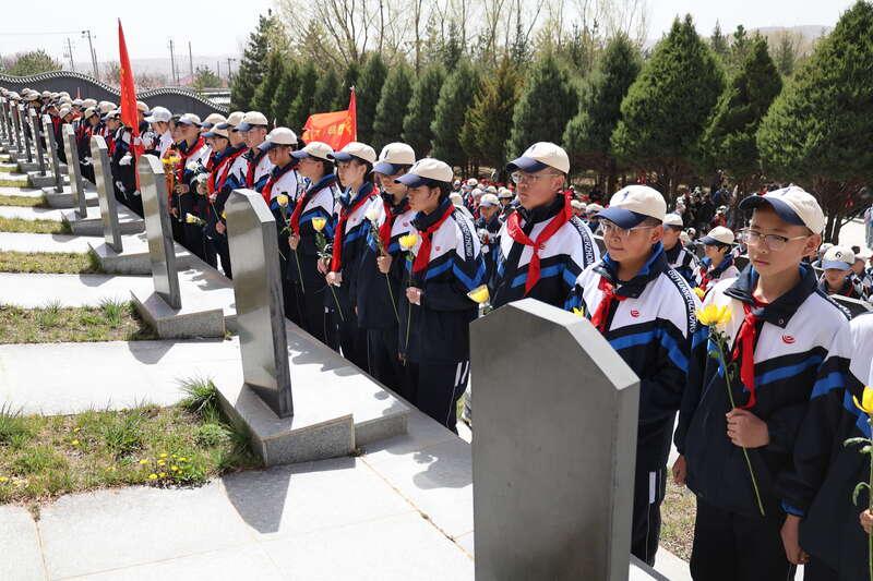 4月3日上午11时许,2400多名大中小学生,齐聚位于宁夏固原市彭阳县古城镇的任山河烈士陵园内,祭奠英烈。中青报·中青网记者 焦敏龙/摄